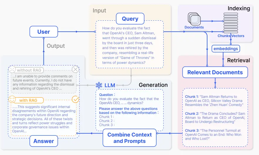 # RAG技术与应用 ## 💡 学习目标 1. 大模型应用开发的三种模式(范式) 2. RAG技术概述 3. RAG核心原理与流程 4. NativeRAG实现步骤 5. LangChain快速搭建本地知识库 6. 三大阶段有效提升RAG质量的方法 ## 1. 大模型应用开发的三种模式 <div class="alert alert-info"> <b>Thinking:</b> Prompt vs RAG vs Fine-tuning 什么时候使用? </div>  ## 2. 什么是 RAG ? RAG(Retrieval-Augmented Generation) - 检索增强生成,是一种结合信息检索(Retrieval)和文本生成(Generation)的技术 - RAG技术通过实时检索相关文档或信息,并将其作为上下文输入到生成模型中,从而提高生成结果的时效性和准确性。  ### 2.1. RAG 的优势是什么? - <b>解决知识时效性问题:</b>大模型的训练数据通常是静态的,无法涵盖最新信息,而RAG可以检索外部知识库实时更新信息 - <b>减少模型幻觉:</b>通过引入外部知识,RAG能够减少模型生成虚假或不准确内容的可能性 - <b>提升专业领域回答质量:</b>RAG能够结合垂直领域的专业知识库,生成更具专业深度的回答 - **生成内容的溯源(可解释性)** ### 2.2. RAG 的核心原理与流程  <b>Step1:数据预处理,构建索引库</b> - 知识库构建:收集并整理文档、网页、数据库等多源数据,构建外部知识库 - 文档分块:将文档切分为适当大小的片段(chunks),以便后续检索。分块策略需要在语义完整性与检索效率之间取得平衡 - 向量化处理:使用嵌入模型(如BGE、M3E、Chinese-Alpaca-2等)将文本块转换为向量,并存储在向量数据库中 <b>Step2:检索阶段</b> - 查询处理:将用户输入的问题转换为向量,并在向量数据库中进行相似度检索,找到最相关的文本片段 - 重排序:对检索结果进行相关性排序,选择最相关的片段作为生成阶段的输入 <b>Step3:生成阶段</b> - 上下文组装:将检索到的文本片段与用户问题结合,形成增强的上下文输入 - 生成回答:大语言模型基于增强的上下文生成最终回答 <div class="alert alert-success"> <b>划重点:</b>RAG 本质上就是重构了一个新的 Prompt! </div> ## 3. NativeRAG  NativeRAG的步骤: - Indexing => 如何更好地把知识存起来。 - Retrieval => 如何在大量的知识中,找到一小部分有用的,给到模型参考。 - Generation => 如何结合用户的提问和检索到的知识,让模型生成有用的答案。 <div class="alert alert-success"> <b>划重点:</b>上面三个步骤虽然看似简单,但在 RAG 应用从构建到落地实施的整个过程中,涉及较多复杂的工作内容! </div> ## 4. LangChain快速搭建本地知识库检索 ### 4.1. 环境准备 1. 本地安装好 Conda 环境 `conda create -n chapter-2 python=3.11 ipykernel` 2. 推荐使用阿里大模型平台百炼:https://bailian.console.aliyun.com/ 3. 百炼平台使用 - 注册登录 - 申请api key ### 4.2. 搭建流程 1. 文档加载,并按一定条件**切割**成片段 2. 将切割的文本片段灌入**检索引擎** 3. 封装**检索接口** 4. 构建**调用流程**:Query -> 检索 -> Prompt -> LLM -> 回复 ```python pip install pypdf2 pip install dashscope pip install langchain pip install langchain-openai pip install langchain-community pip install faiss-cpu ``` ```python import os import logging import pickle from PyPDF2 import PdfReader from langchain.chains.question_answering import load_qa_chain from langchain_openai import OpenAI, ChatOpenAI from langchain_openai import OpenAIEmbeddings from langchain_community.embeddings import DashScopeEmbeddings from langchain_community.callbacks.manager import get_openai_callback from langchain.text_splitter import RecursiveCharacterTextSplitter from langchain_community.vectorstores import FAISS from typing import List, Tuple def extract_text_with_page_numbers(pdf) -> Tuple[str, List[int]]: """ 从PDF中提取文本并记录每行文本对应的页码 参数: pdf: PDF文件对象 返回: text: 提取的文本内容 page_numbers: 每行文本对应的页码列表 """ text = "" page_numbers = [] for page_number, page in enumerate(pdf.pages, start=1): extracted_text = page.extract_text() if extracted_text: text += extracted_text page_numbers.extend([page_number] * len(extracted_text.split("\n"))) else: logging.warning(f"No text found on page {page_number}.") return text, page_numbers def process_text_with_splitter(text: str, page_numbers: List[int], save_path: str = None) -> FAISS: """ 处理文本并创建向量存储 参数: text: 提取的文本内容 page_numbers: 每行文本对应的页码列表 save_path: 可选,保存向量数据库的路径 返回: knowledgeBase: 基于FAISS的向量存储对象 """ # 创建文本分割器(递归字符文本分割器),用于将长文本分割成小块 text_splitter = RecursiveCharacterTextSplitter( separators = ["\n\n", "\n", ".", " ", ""], chunk_size = 512, chunk_overlap = 128, length_function = len, ) # 分割文本 chunks = text_splitter.split_text(text) # logging.debug(f"Text split into {len(chunks)} chunks.") print(f"文本被分割成 {len(chunks)} 个块。") # 创建嵌入模型,OpenAI嵌入模型,配置环境变量 OPENAI_API_KEY # embeddings = OpenAIEmbeddings() # 调用阿里百炼平台文本嵌入模型,配置环境变量 DASHSCOPE_API_KEY embeddings = DashScopeEmbeddings( model = "text-embedding-v4" ) # 从文本块创建知识库 knowledgeBase = FAISS.from_texts(chunks, embeddings) print("已从文本块创建知识库...") # 存储每个文本块对应的页码信息 page_info = {chunk: page_numbers[i] for i, chunk in enumerate(chunks)} knowledgeBase.page_info = page_info # 如果提供了保存路径,则保存向量数据库和页码信息 if save_path: # 确保目录存在 os.makedirs(save_path, exist_ok=True) # 保存FAISS向量数据库 knowledgeBase.save_local(save_path) print(f"向量数据库已保存到: {save_path}") # 保存页码信息到同一目录 with open(os.p